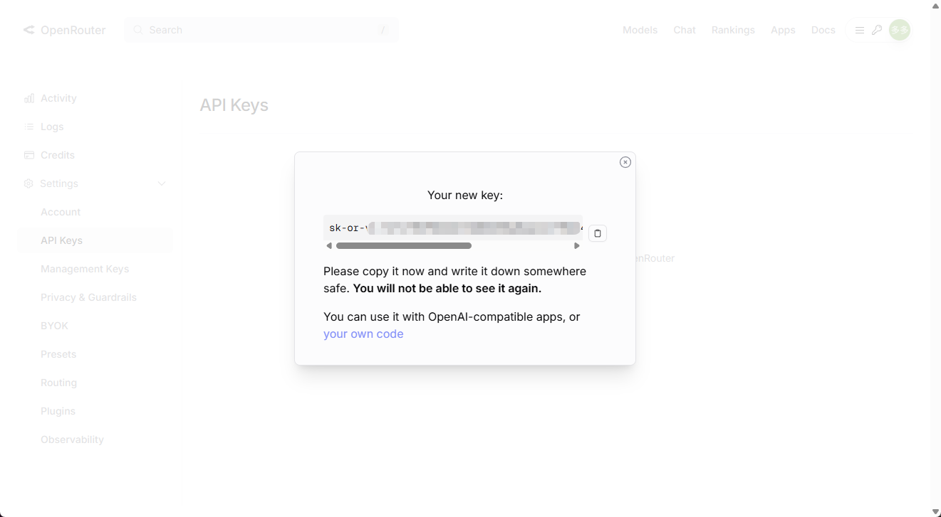 - API Key: 填入您刚刚获取的 OpenRouter API Key。
